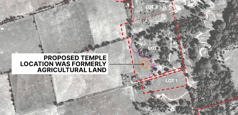 The designated site for the Temple building was used as agricultural land as recently as 1954. It is surrounded by a former landfill site (closed in 1978) – now the German Mills Settlers Park and Natural Habitat to the north, the Bayview Golf and Country Club to the west, and Bercy (Wycliffe) Park to the east.